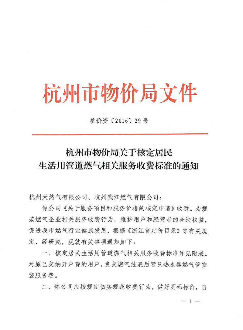 杭價資【2016】29號——杭州市物價局關于核定居民生活用管道燃氣相關服務收費標準的通知