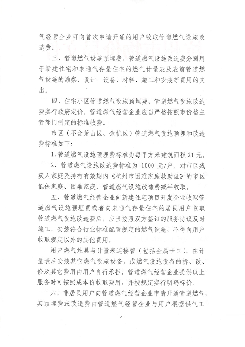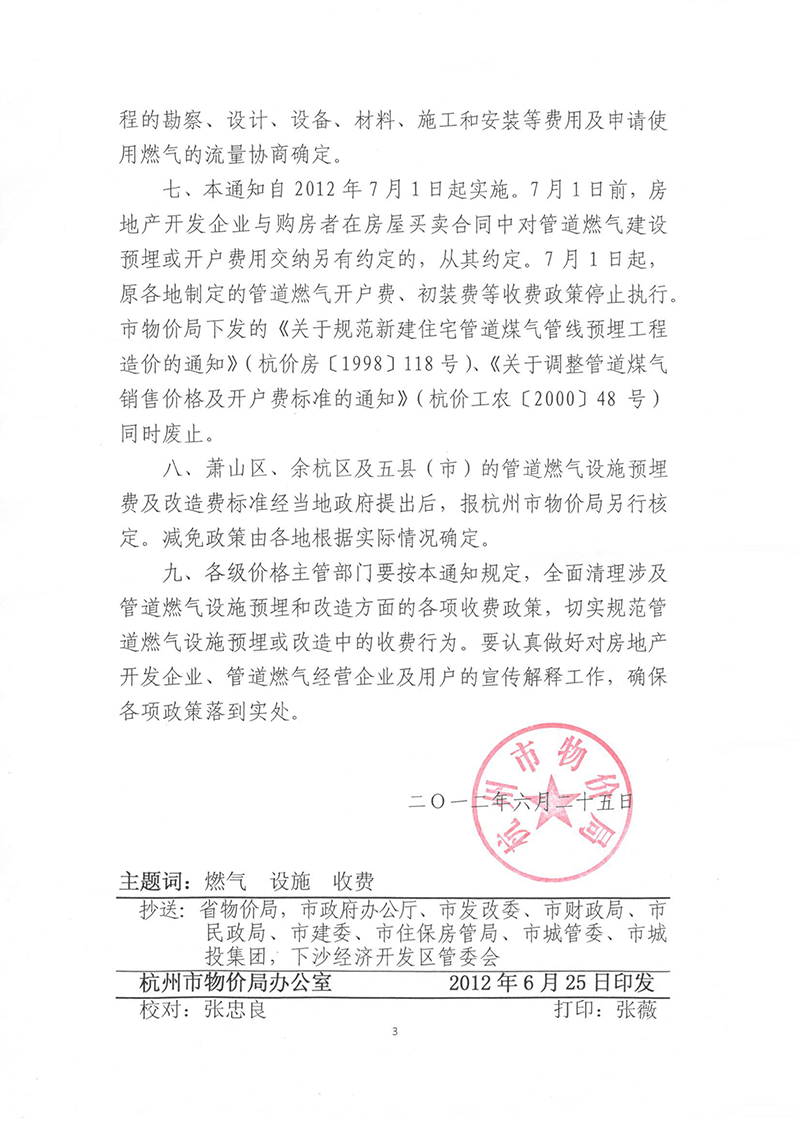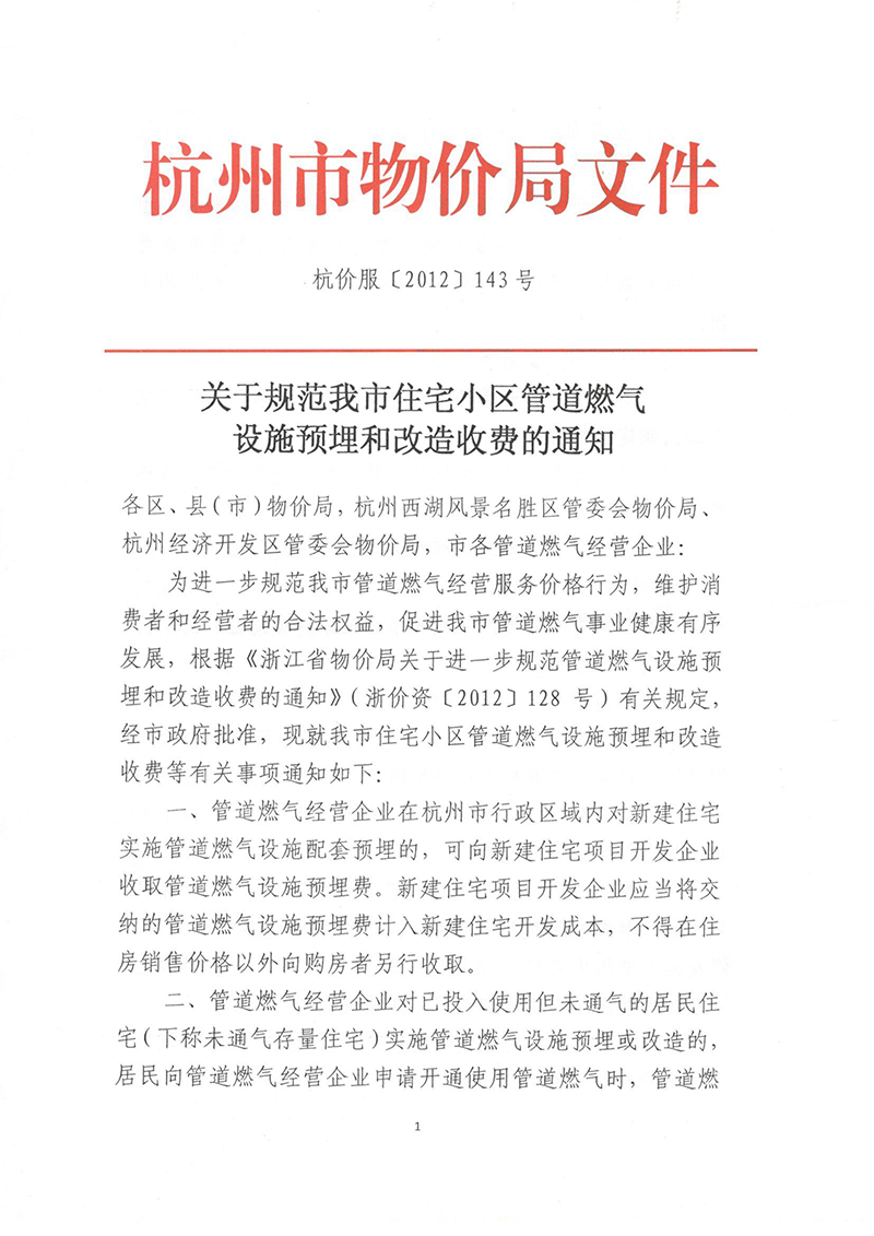 杭價服【2012】143號——關于規范我市住宅小區管道燃氣設施預埋和改造收費的通知